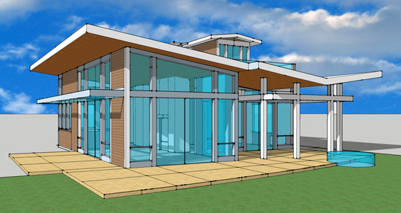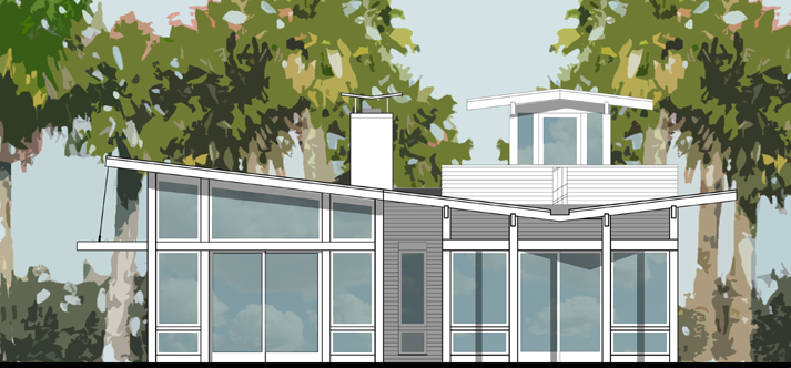 The client was interested in mid-century modern design for the 1800 gsf oceanfront residence. The butterfly roof line organized the primarily glass facade enclosure. Project unbuilt.