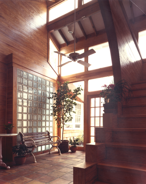 This two-story space served as a unique foyer/family room link between a one-story cottage and a two-story detached garage structure. Construction was completed in 1984.