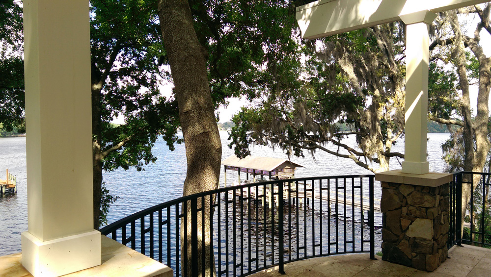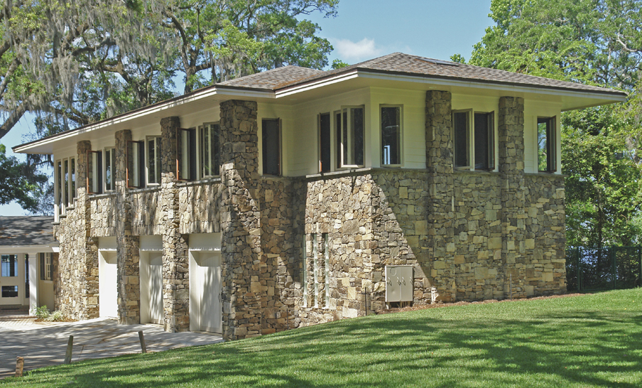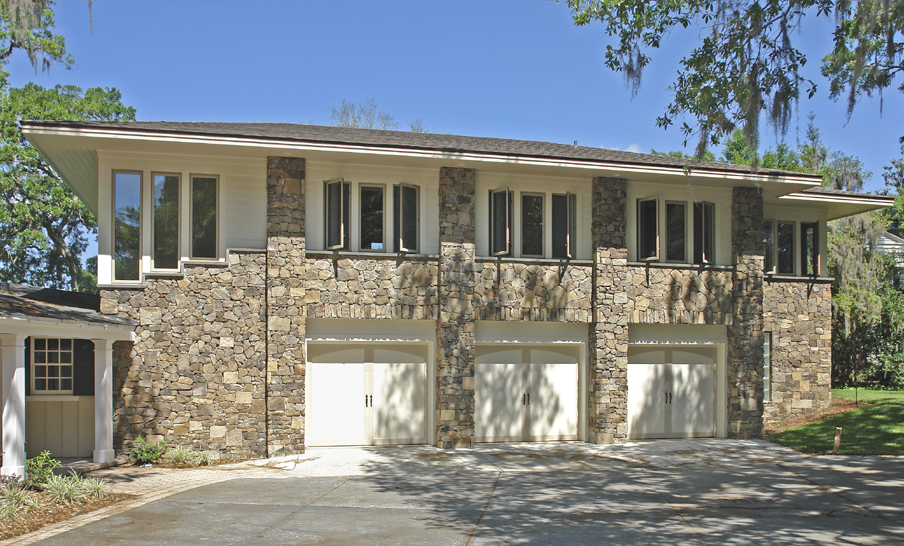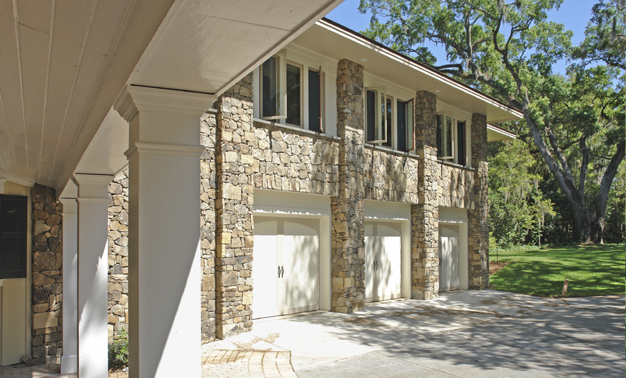 Phase one includes a 3 car garage and second floor guest house. The masonry structure will be clad in natural stone and wood lap siding. Phase two, consisting of a 50′ river room and related support areas, was completed in 2010.