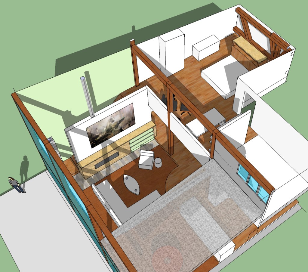 The concept design phase is complete for a 2 story 3000 gsf walkout design located on a wooded sloping lot. A cottage is also part of the project, located downslope on the site. The new residence is wrapped in a fieldstone base, and a composite panel enclosure with a metal roof. Construction to begin in spring 2023.