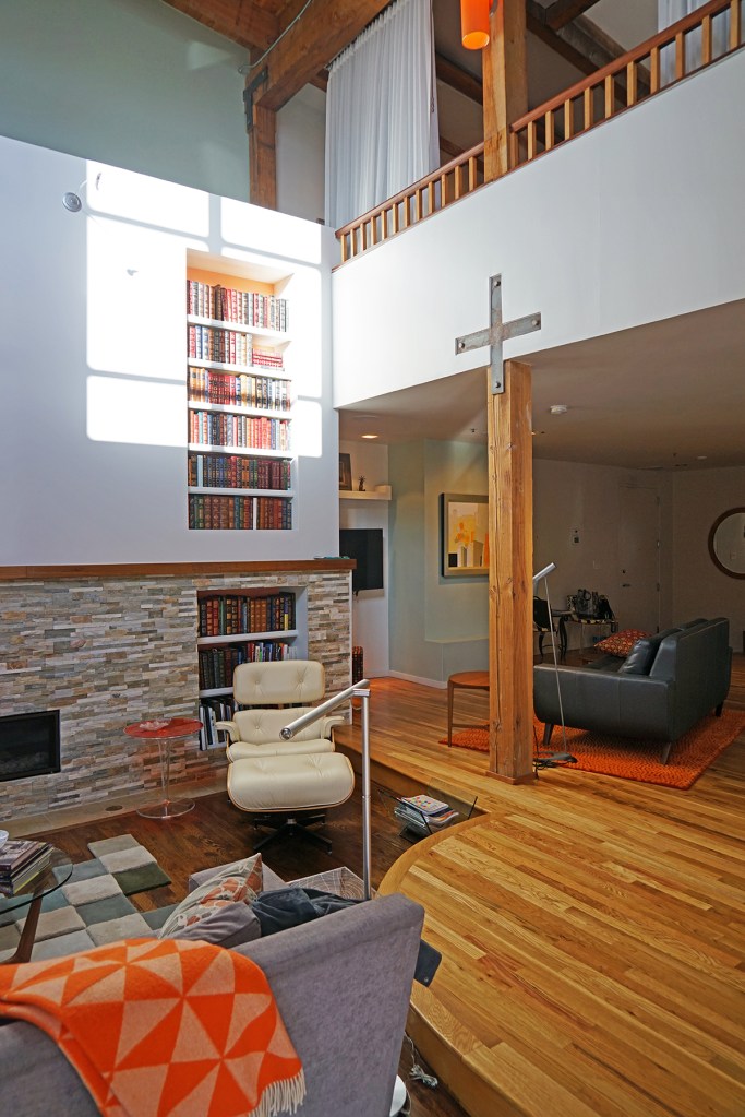 The 1886 penthouse loft was upgraded to include a new FP wall, stair with a linear gas fireplace, & various plan modifications, including a new outdoor deck and related improvements. Completed 2016.